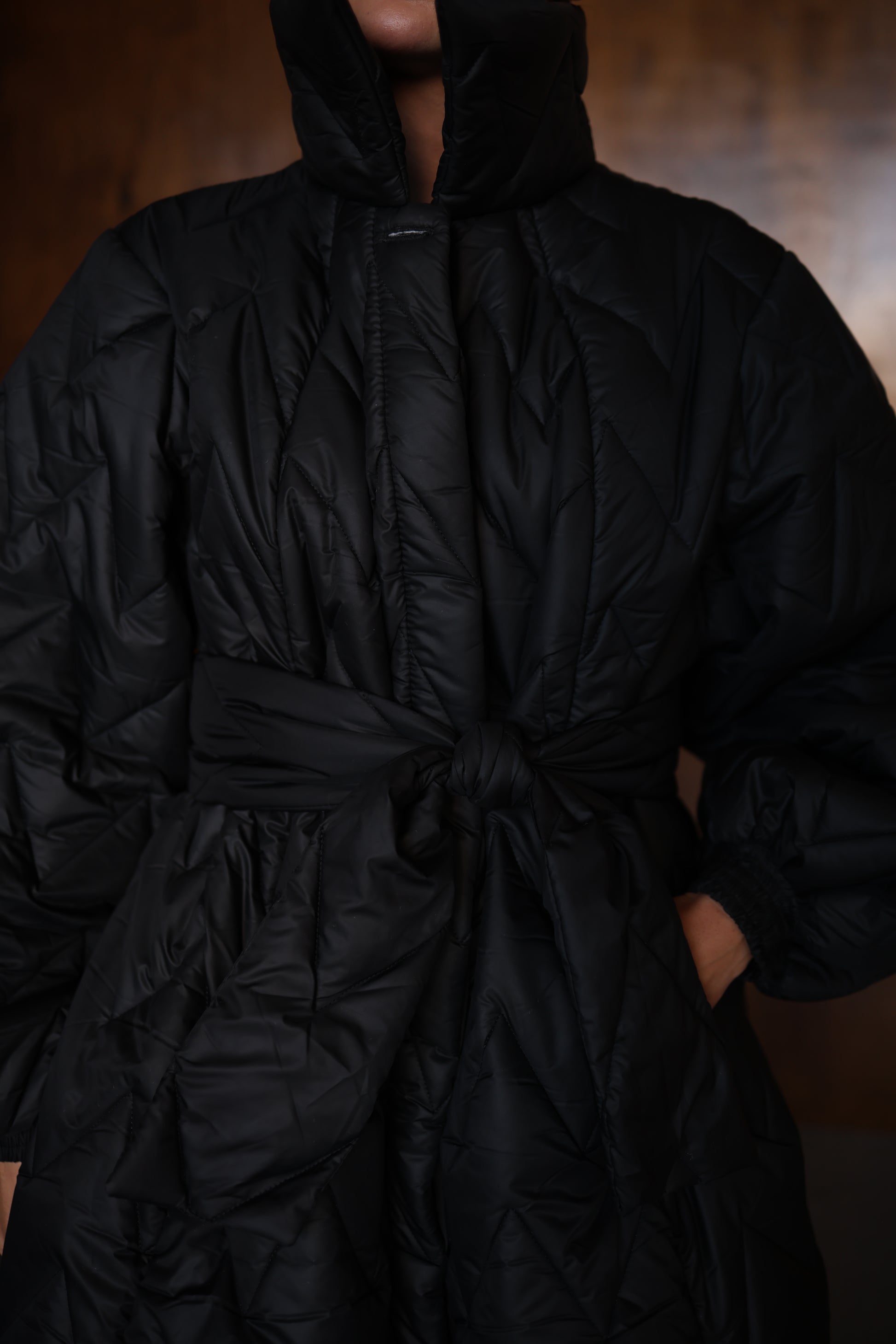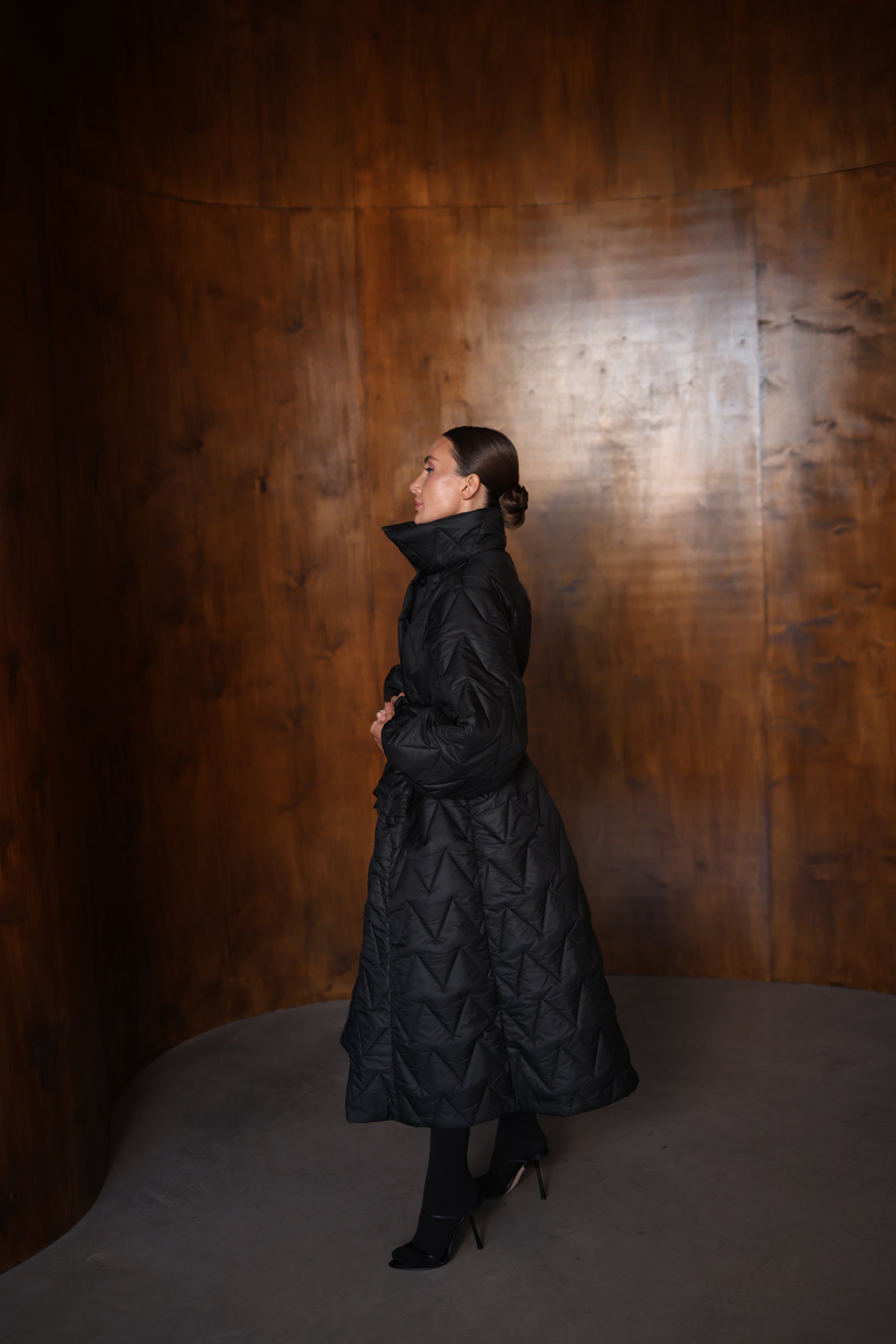 Winter coat. Oversized. The length of the coat is 125 cm. Temperature regime up to -10 degrees. The model is wearing size XS/S, the model's height is 170 cm.