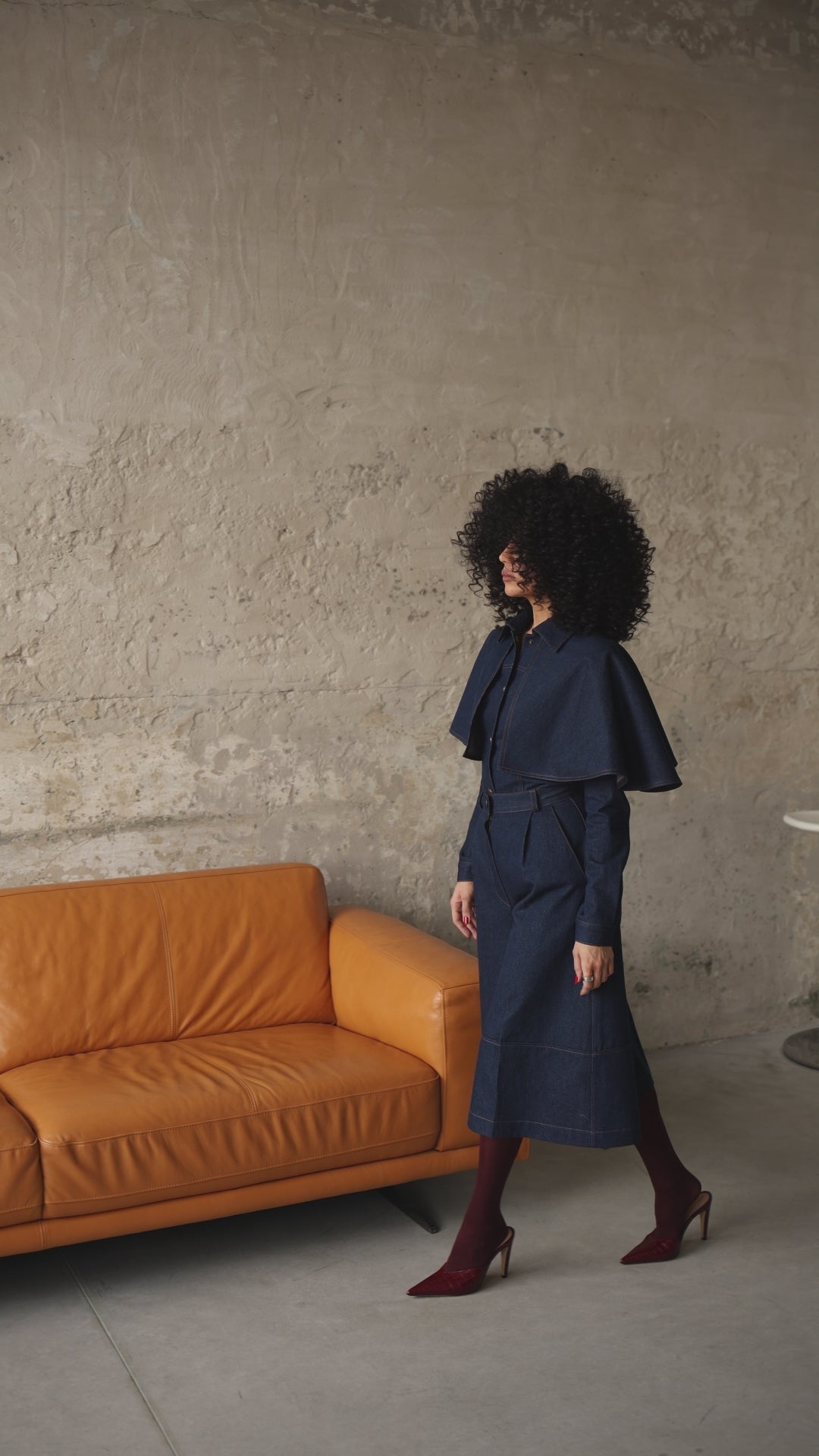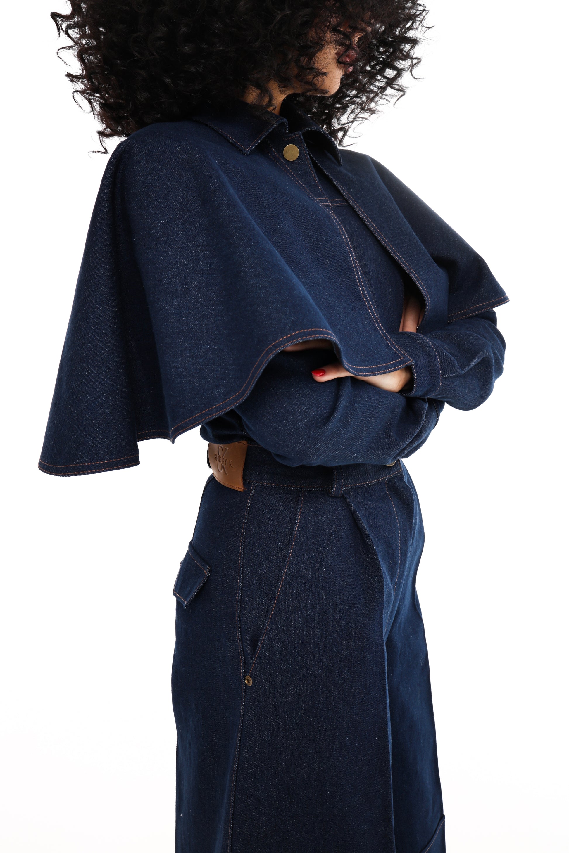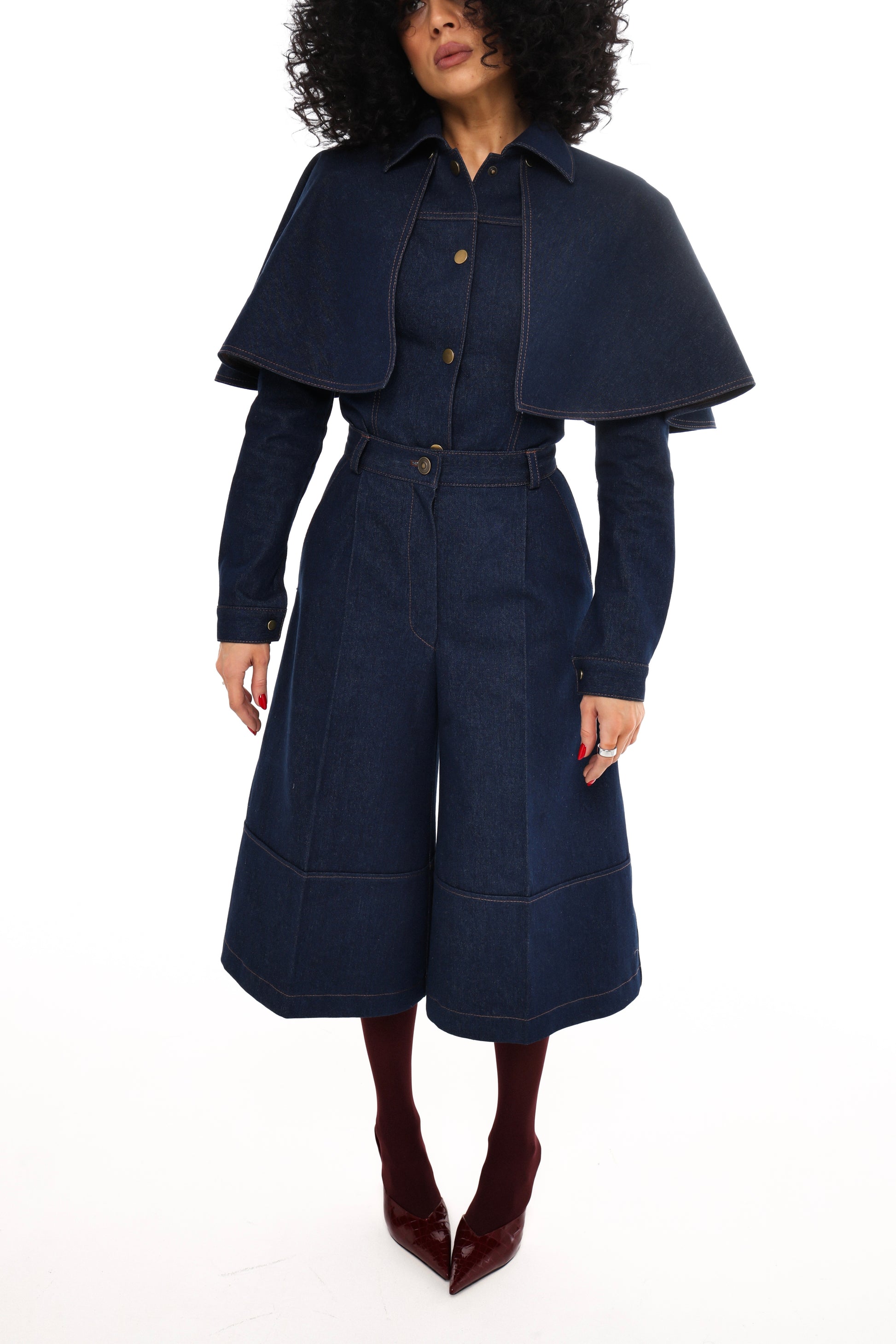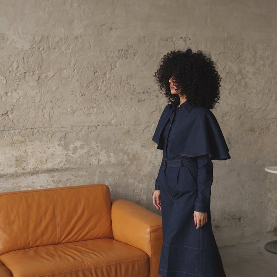 Denim bermuda shorts in a deep navy shade with accent contrast stitching. The high-rise fit and defined waist highlight the silhouette, while the wide, below-the-knee cut creates a modern structured look. Length — 76 cm.