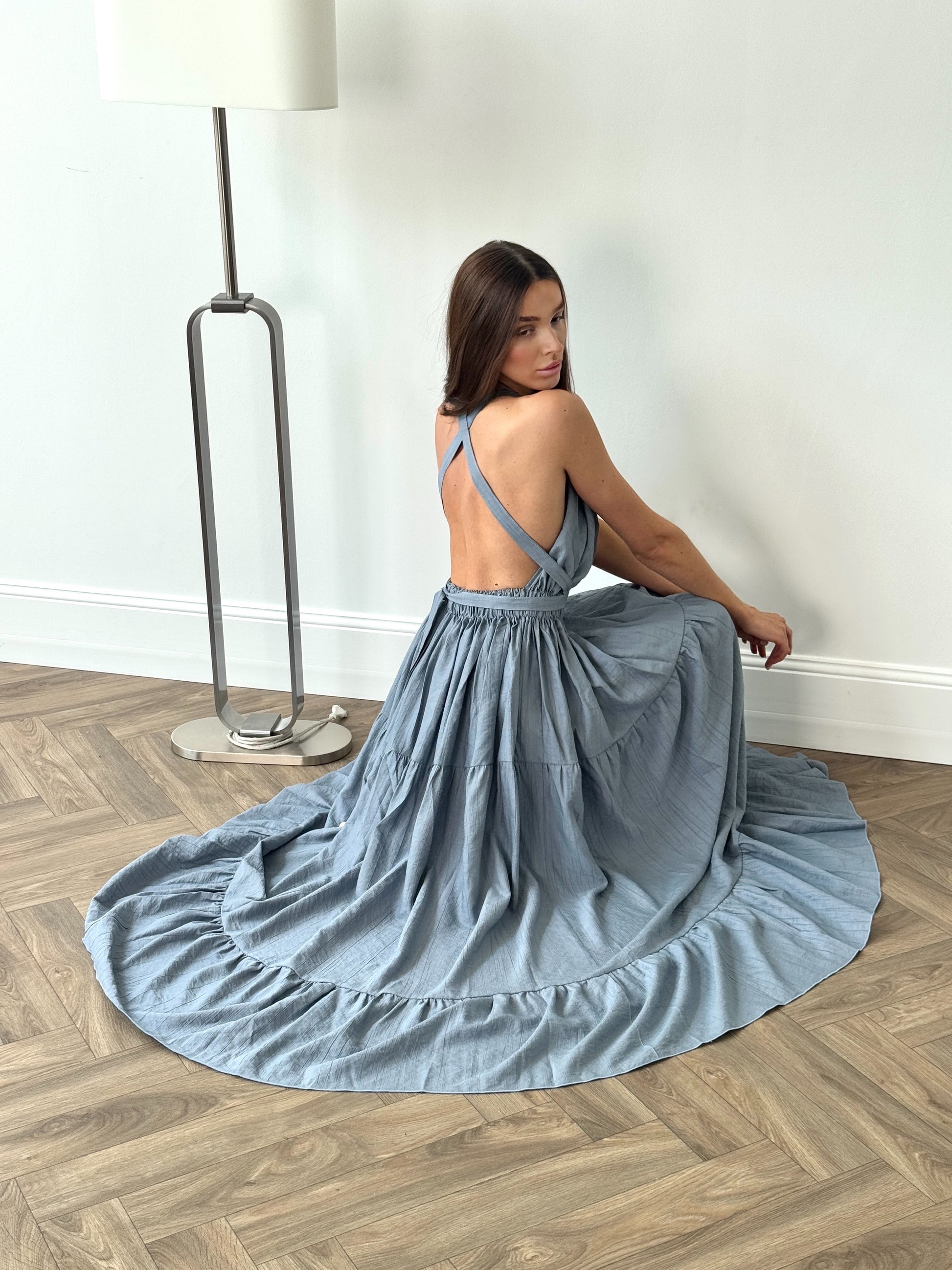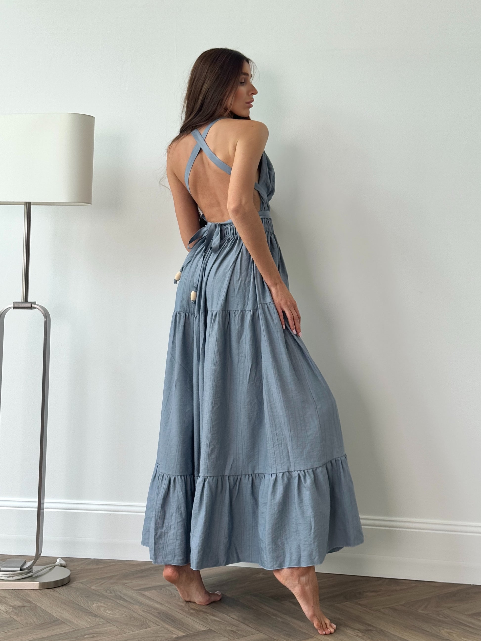 Dress with laces. Waist of the dress has elastic which fits sizes from XS to L. The length of the dress from the waist down is 107cm. The model's hight is 172cm.