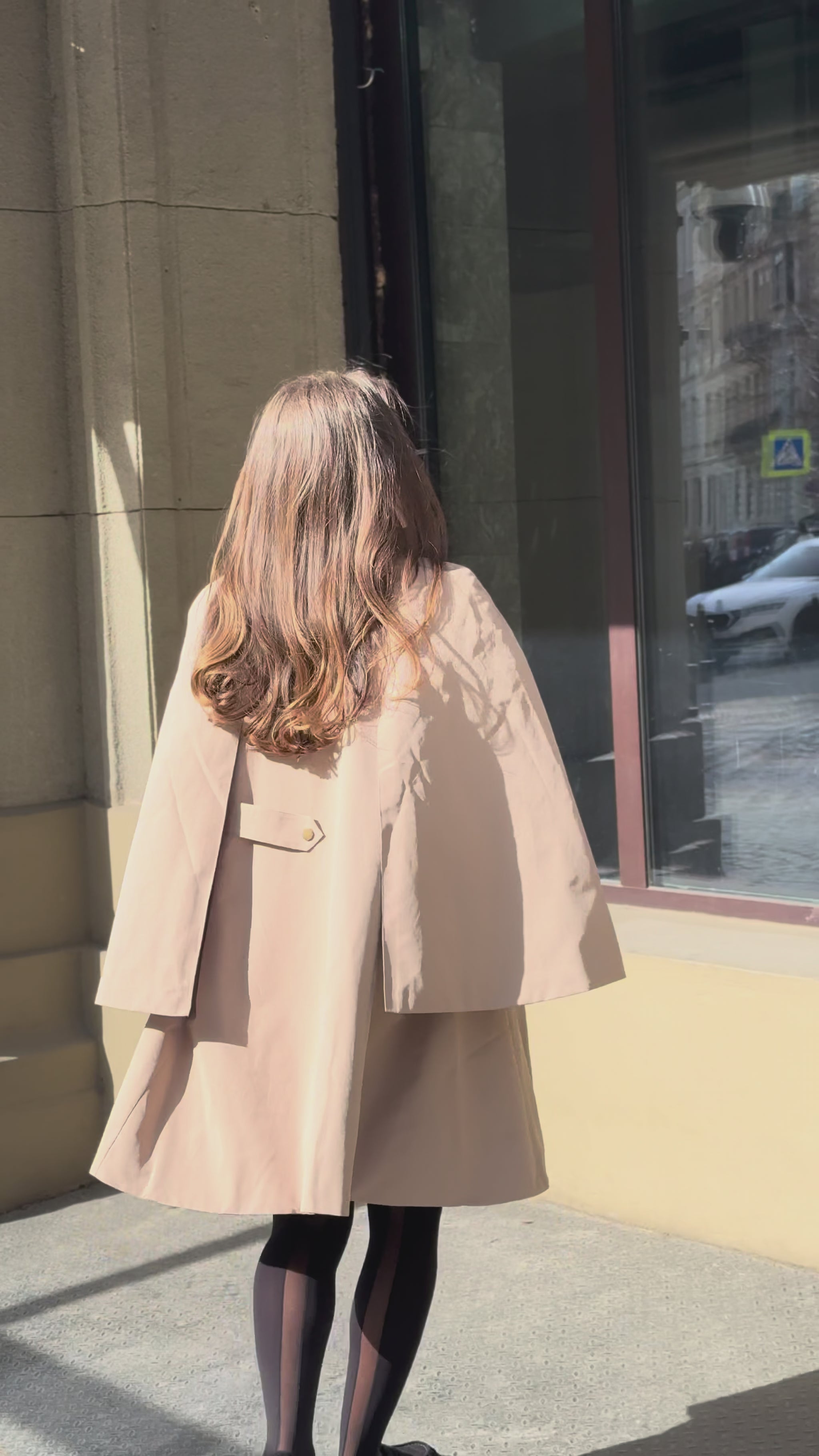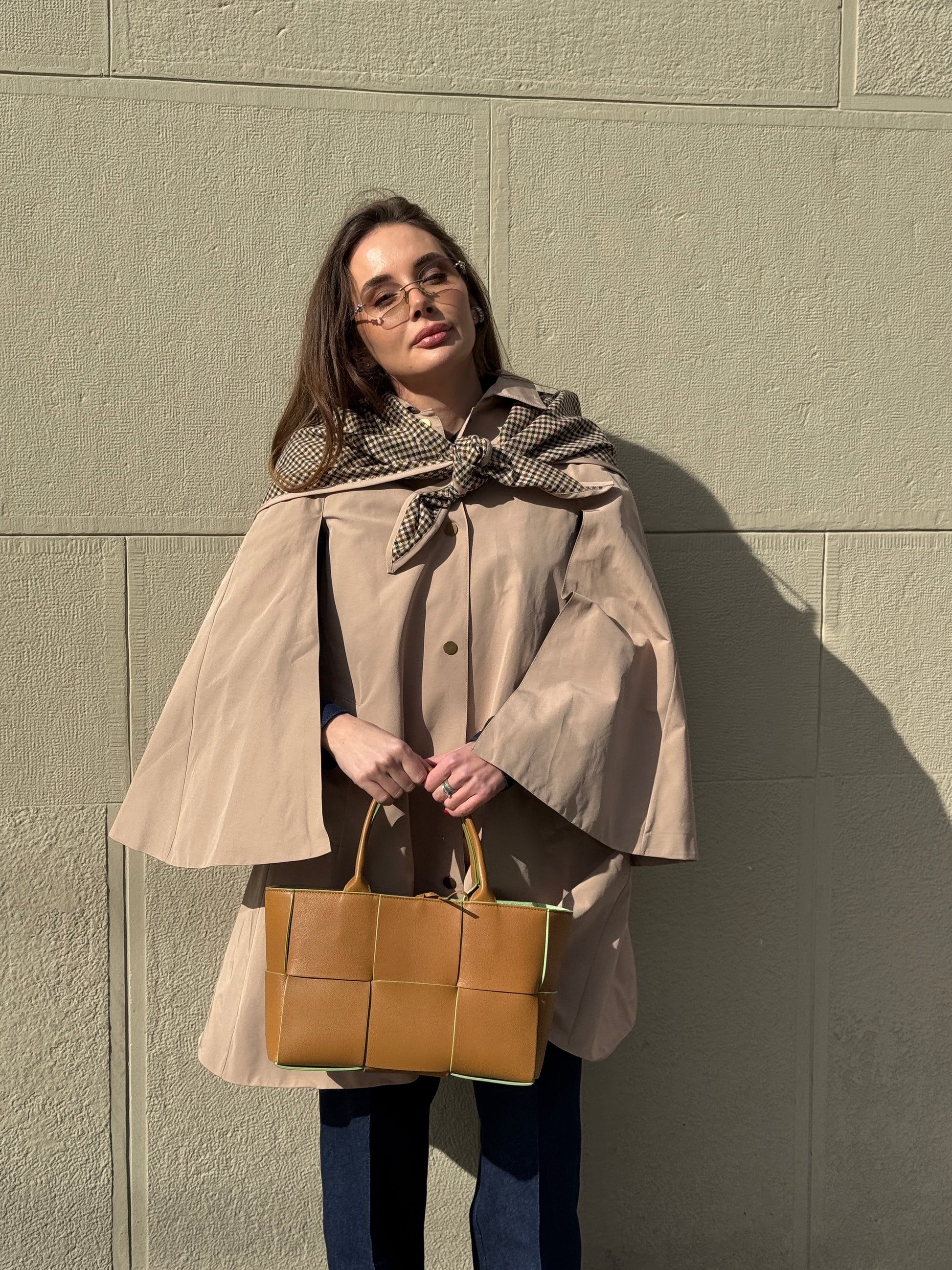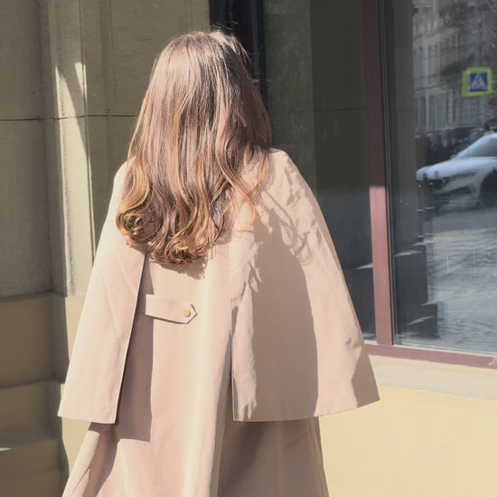 Beige cape trench coat with a clean, relaxed silhouette. The design features arm slits and snap-button closure. A checked scarf is included, adding an elegant accent to the look.
